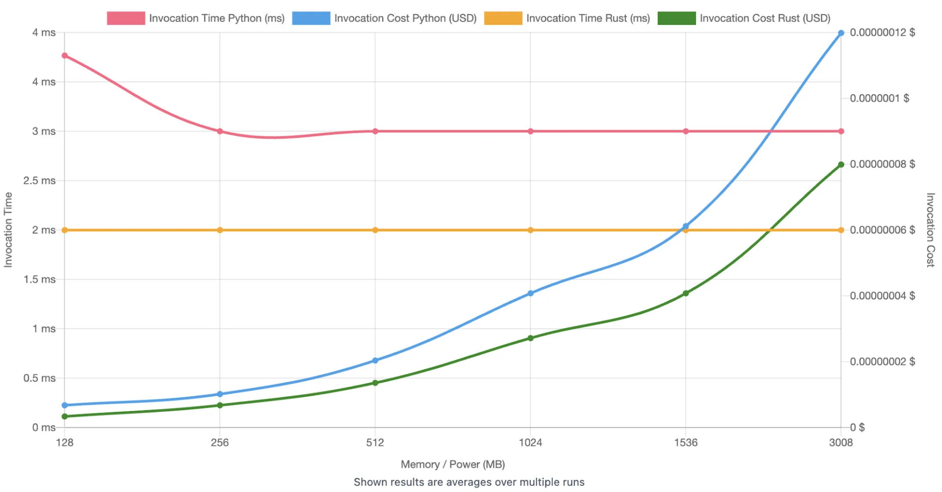 Thanks to its performance characteristics, Rust can significantly reduce the cost of cold starts. Typically, Rust cold starts are in the order of 10-50ms, as opposed to 500-2000ms generally observed in Python, JavaScript and Java.